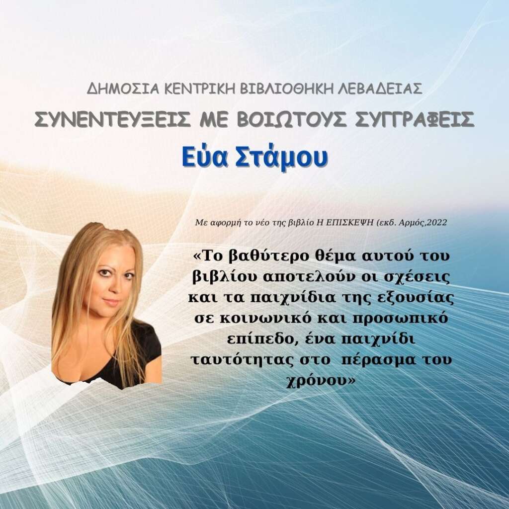 Στη στήλη της Βιβλιοθήκης μας «Συνεντεύξεις με Βοιωτούς συγγραφείς», σήμερα φιλοξενείται η Εύη Στάμου, Ψυχολόγος και συγγραφέας προβάλλοντας την Ελλάδα στον διεθνή χώρο, μας παρουσιάζει σήμερα μια συλλογή δεκαέξι διηγημάτων με τον τίτλο «Η επίσκεψη» (Αρμός, 2022).